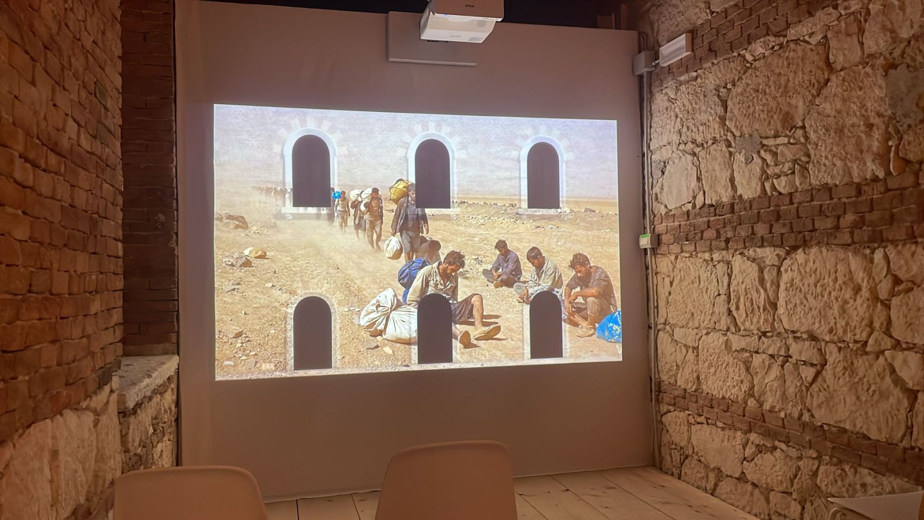 The castle facade ceases to be a wall and becomes a window wide open to the universal journey of human existence. The wood fiber dissolves and recomposes in the Verona sky, projecting the silent cry and hope of migrants.